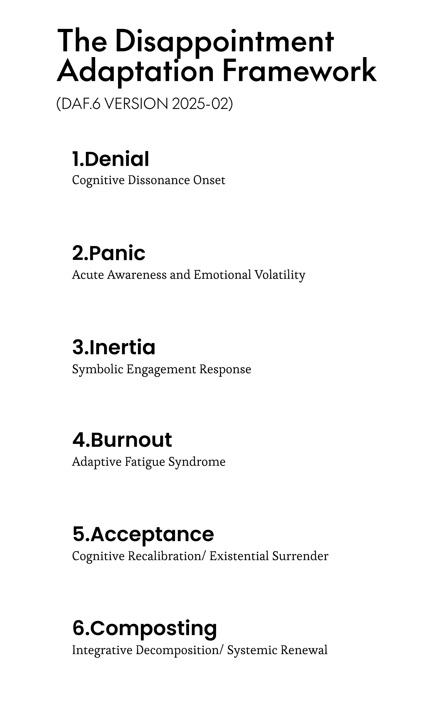 At The Disappointment Institute, we offer structure — because even collapse deserves a coherent framework. The Disappointment Adaptation Framework (DAF-6) charts the six scientifically stages of modern decline. Based on years of fieldwork among anxious professionals, hopeful policymakers, and people who “just need closure,” the DAF-6 provides a stable vocabulary for the instability ahead.